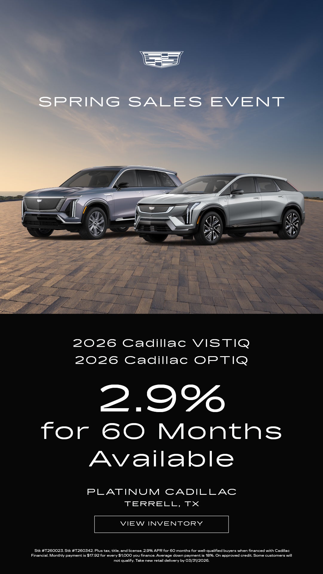 Stk #T260023. Stk #T260342. Plus tax, title, and license. 2.9% APR for 60 months for well-qualified buyers when financed with Cadillac Financial. Monthly payment is $17.92 for every $1,000 you finance. Average down payment is 18%. On approved credit. Some customers will not qualify. Take new retail delivery by 03/31/2026.