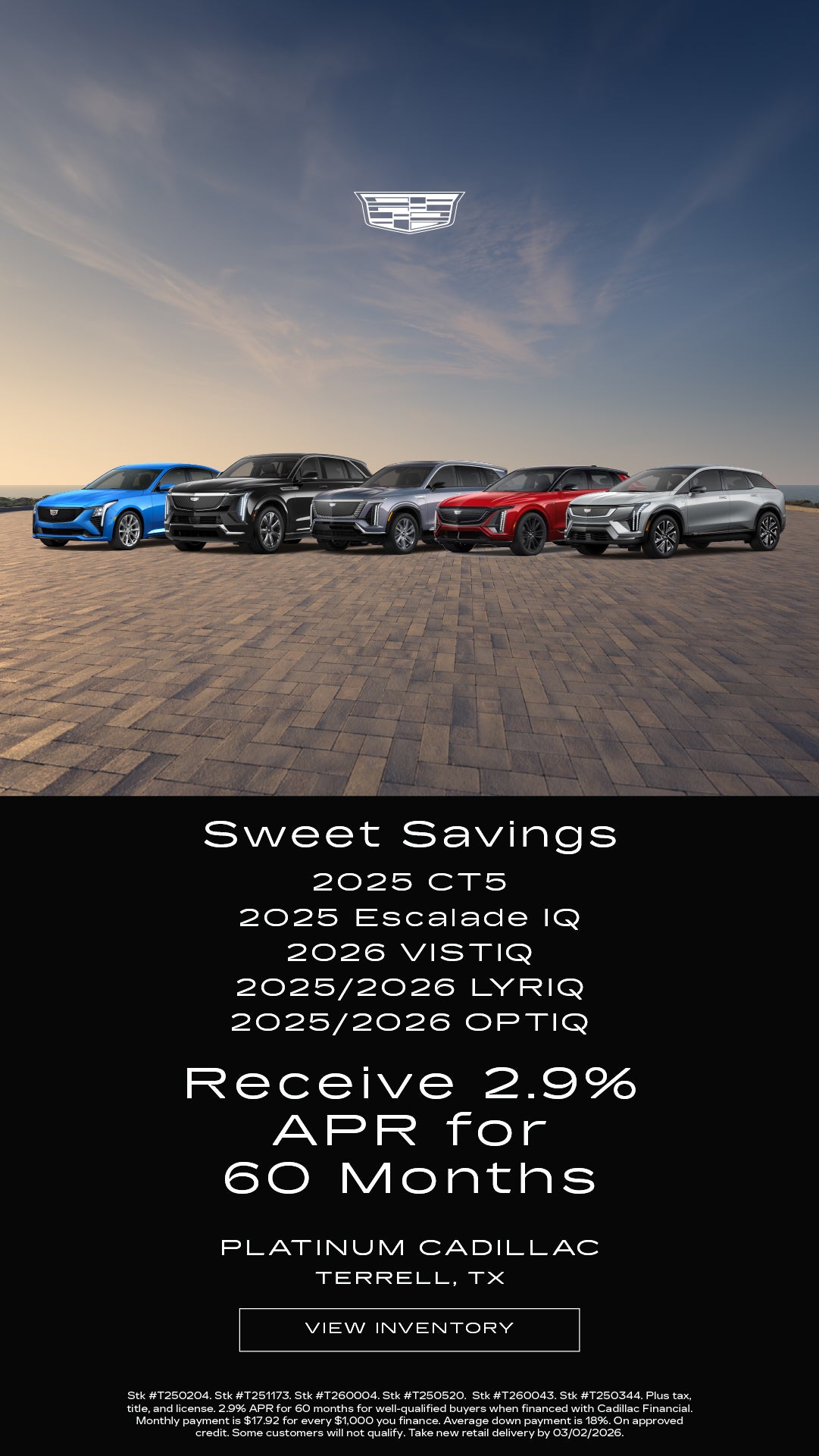 Stk #T250204. Stk #T251173. Stk #T260004. Stk #T250520. Stk #T260043. Stk #T250344. Plus tax, title, and license. 2.9% APR for 60 months for well-qualified buyers when financed with Cadillac Financial. Monthly payment is $17.92 for every $1,000 you finance. Average down payment is 18%. On approved credit. Some customers will not qualify. Take new retail delivery by 03/02/2026.