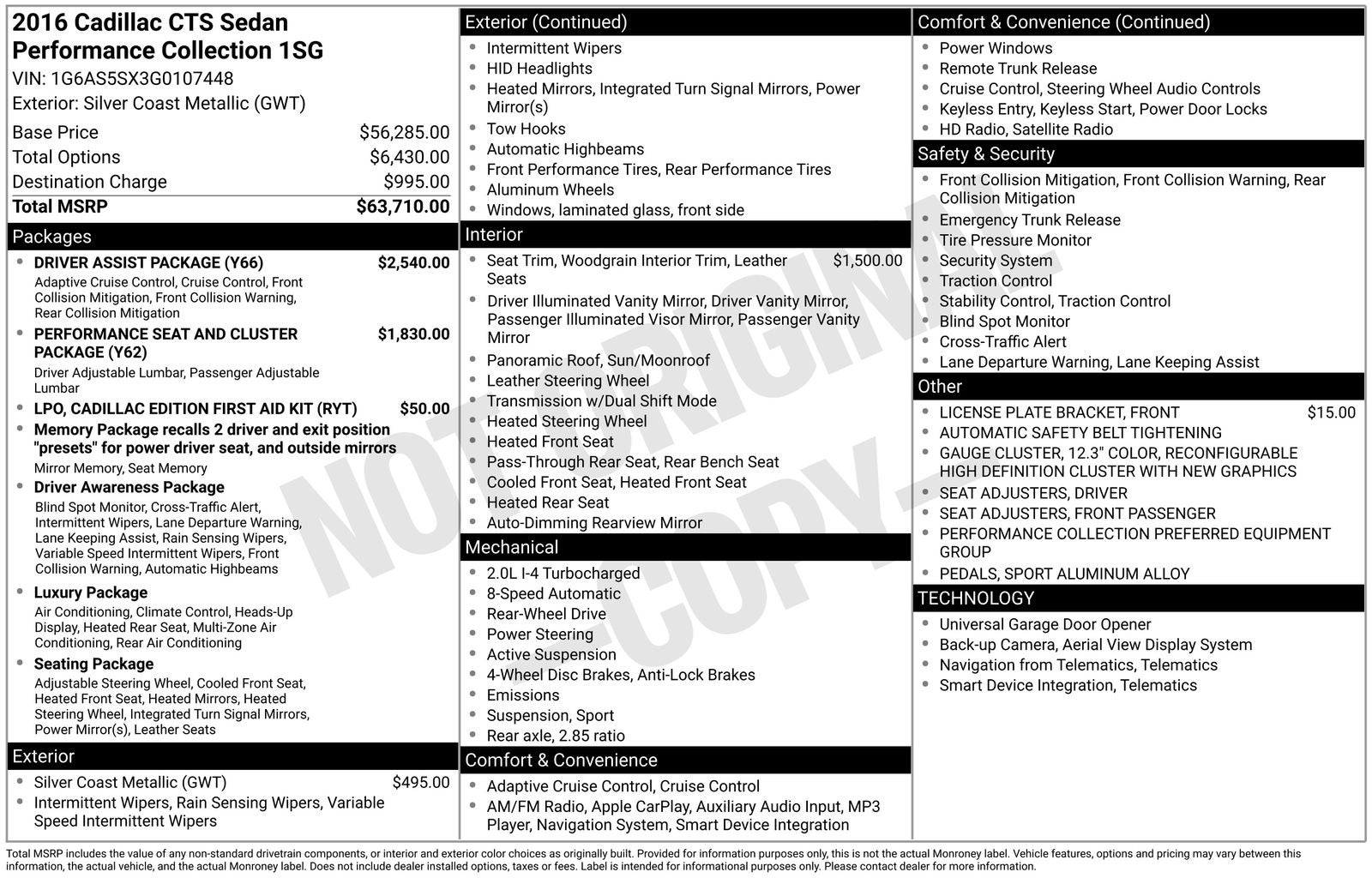 This 2016 Cadillac CTS comes nicely equipped with Driver Assist Package (Adaptive Full-Speed Range Cruise Control, Automatic Safety Belt Tightening, and Front & Rear Automatic Braking), Driver Awareness Package (Forward Collision Alert, IntelliBeam Headlamps, Lane Change Alert, Lane Keep Assist w/Lane Departure Warning, Rainsense Wipers, Rear Cross Traffic Alert, and Side Blind Zone Alert), Luxury Package (110V Power Receptacle, Color Head-Up Display, Heated Rear Outboard Seating Positions, Illuminated Door Handles, Illuminated Front Door Sill Plates, Manual Rear Side Window Sunshades, Power Rear Window Sunshade, and Tri-Zone Climate Control), Performance Seat & Cluster Package (12.3 Color Reconfigurable Gauge Cluster, Driver Seat Adjuster, Front Passenger Seat Adjuster, Full Leather Seating Surfaces, Performance Front Bucket Seats, and Sport Aluminum Alloy Pedals), Preferred Equipment Group 1SG (Automatic Parking Assist, Split-Folding Rear Seat, and UltraView Power Sunroof), Seating Package (Heated Driver & Front Passenger Seats, Heated Steering Wheel Rim, Heated/Ventilated Driver & Front Passenger Seats, LED Accent Lighting, Outside Heated Power-Adjustable Mirrors, and Power Tilt & Telescoping Steering Column), 13 Speakers, 4-Wheel Disc Brakes, ABS brakes, Adaptive suspension, Air Conditioning, Alloy wheels, AM/FM radio: SiriusXM, Anti-whiplash front head restraints, Apple CarPlay, Auto High-beam Headlights, Auto-dimming door mirrors, Auto-dimming Rear-View mirror, Automatic temperature control, Bose Centerpoint Surround Sound 13-Speaker System, Brake assist, Bumpers: body-color, Cadillac Edition First Aid Kit (LPO) (DISC), Compass, Delay-off headlights, Driver door bin, Driver vanity mirror, Dual front impact airbags, Dual front side impact airbags, Electronic Stability Control, Emergency communication system: OnStar Guidance, Exterior Parking Camera Rear, Four wheel independent suspension, Front anti-roll bar, Front Bucket Seats, Front Center Armrest w/Storage, Front dual zone A/C, Front License Plate Bracket, Front reading lights, Fully automatic headlights, Garage door transmitter, Genuine wood console insert, Genuine wood dashboard insert, Genuine wood door panel insert, Heads-Up Display, Heated door mirrors, Heated front seats, Heated rear seats, HEATED STEERING WHEEL, High-Intensity Discharge Headlights, Illuminated entry, Knee airbag, Lane Departure Warning System, Leather Seating Surfaces, Leather Shift Knob, Leather steering wheel, Low tire pressure warning, Magnetic Ride Control, Memory seat, Navigation System, Occupant sensing airbag, Outside temperature display, Overhead airbag, Panic alarm, Passenger door bin, Passenger vanity mirror, Power door mirrors, Power driver seat, Power moonroof: UltraView, Power passenger seat, Power steering, Power windows, Premium audio system: Cadillac CUE, Radio data system, Radio: Cadillac CUE Info/Media Cont/Embedded Nav, Rain–Sensitive Windshield Wipers, Rear air conditioning, Rear anti-roll bar, Rear reading lights, Rear seat center armrest, Rear side impact airbag, Rear Window Blind, Rear window defroster, Remote keyless entry, Security system, SiriusXM Satellite & HD Radio, Speed control, Speed-sensing steering, Split folding rear seat, Steering wheel mounted audio controls, Tachometer, Telescoping steering wheel, Tilt steering wheel, Traction control, Trip computer, Turn signal indicator mirrors, Variably intermittent wipers, Ventilated front seats, Voltmeter, and Wheels: 18 x 8.5 15-Spoke Premium Painted Alloy.