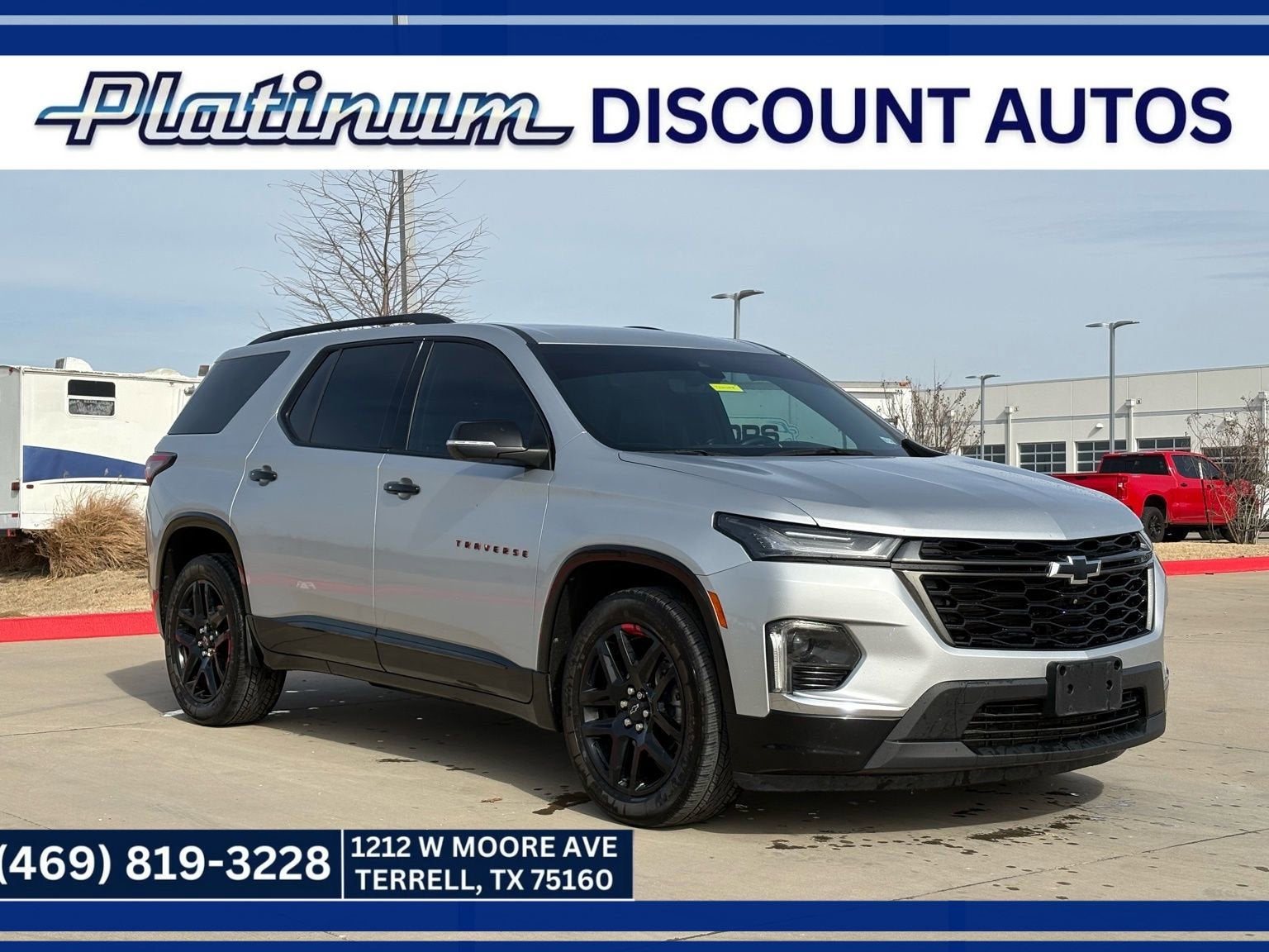 This 2022 Chevrolet Traverse Premier in Silver Ice Metallic comes nicely equipped with the following features: 3.6L V6 SIDI VVT 9-Speed Automatic FWD Front License Plate Bracket Mounting Package, Preferred Equipment Group 1LZ (Heated 2nd Row Outboard Position Seats, Heated Driver & Front Passenger Seats, Heated Steering Wheel, Rear Park Assist w/Audible Warning, and Ventilated Driver & Front Passenger Seats), Redline Edition (Black Door Handles, Black Roof Rails, Dual SkyScape 2-Panel Power Sunroof, Ornamentation, Redline Accent Decals (LPO), and Wheels: 20 Gloss Black Painted Alum w/Red Stripes), Trailering Equipment (Heavy-Duty Cooling System, Hitch Guidance w/Hitch View, and Trailering Assist Guidelines), 10 Speakers, 3.49 Axle Ratio, 3rd row seats: split-bench, 4-Wheel Disc Brakes, 6-Way Power Front Passenger Seat, 8-Way Power Driver Seat Adjuster, ABS brakes, Air Conditioning, Alloy wheels, AM/FM radio: SiriusXM with 360L, Apple CarPlay/Android Auto, Auto High-beam Headlights, Auto-dimming door mirrors, Auto-dimming Rear-View mirror, Automatic temperature control, Bose Premium 10-Speaker Audio System Feature, Brake assist, Bumpers: body-color, Compass, Delay-off headlights, Driver door bin, Driver vanity mirror, Dual front impact airbags, Dual front side impact airbags, Electronic Stability Control, Emergency communication system: OnStar Guidance, Four wheel independent suspension, Front anti-roll bar, Front Bucket Seats, Front Center Armrest, Front dual zone A/C, Front Passenger 2-Way Power Lumbar, Front reading lights, Fully automatic headlights, Garage door transmitter, Heated door mirrors, Heated front seats, Heated rear seats, Heated steering wheel, Illuminated entry, Leather steering wheel, Low tire pressure warning, Memory seat, Navigation System, Occupant sensing airbag, Outside temperature display, Overhead airbag, Overhead console, Panic alarm, Passenger door bin, Passenger vanity mirror, Perforated Leather-Appointed Seat Trim, Power door mirrors, Power Driver Lumbar Control, Power driver seat, Power Liftgate, Power passenger seat, Power steering, Power windows, Premium audio system: Chevrolet Infotainment 3 Plus, Radio data system, Radio: Chevrolet Infotainment 3 Plus System w/Navi, Rear air conditioning, Rear anti-roll bar, Rear reading lights, Rear window defroster, Rear window wiper, Remote keyless entry, Roof rack: rails only, Security system, SiriusXM w/360L, Speed control, Speed-sensing steering, Spoiler, Steering wheel memory, Steering wheel mounted audio controls, Tachometer, Telescoping steering wheel, Tilt steering wheel, Traction control, Trip computer, Turn signal indicator mirrors, Variably intermittent wipers, Ventilated front seats, Voltmeter, and Wheels: 20 Metallic Machined-Face Aluminum. 18/27 City/Highway MPG