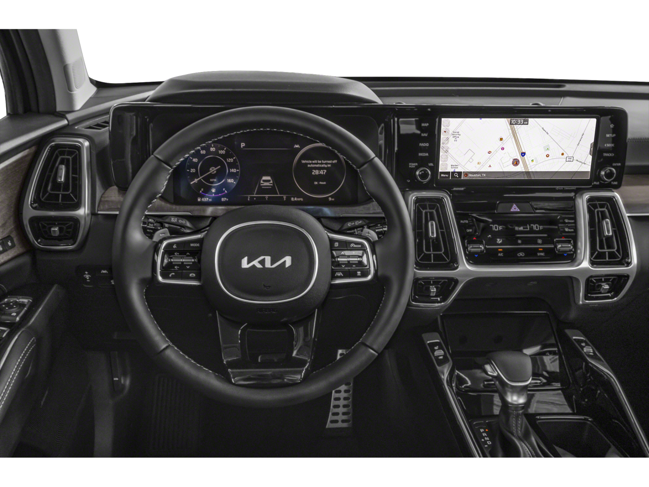 This 2023 Kia Sorento X-Line SX Prestige comes nicely equipped with the following X-Line Rust Interior Color Package, 12 Speakers, 3.316 Axle Ratio, 3rd row seats: split-bench, 4-Wheel Disc Brakes, ABS brakes, Air Conditioning, Alloy wheels, AM/FM radio: SiriusXM, Apple CarPlay & Android Auto, Auto High-beam Headlights, Auto-dimming Rear-View mirror, Automatic temperature control, Brake assist, Bumpers: body-color, Carpet Floor Mats, Carpeted Cargo Mat w/Seatback Protection, Delay-off headlights, Driver door bin, Driver vanity mirror, Dual front impact airbags, Dual front side impact airbags, Electronic Stability Control, Emergency communication system, Four wheel independent suspension, Front anti-roll bar, Front Bucket Seats, Front Center Armrest, Front dual zone A/C, Front fog lights, Front reading lights, Fully automatic headlights, Garage door transmitter: HomeLink, Heated & Ventilated Front Bucket Seats, Heated door mirrors, Heated front seats, Heated rear seats, Heated steering wheel, Illuminated entry, Knee airbag, Leather steering wheel, Low tire pressure warning, Memory seat, Navigation System, Occupant sensing airbag, Outside temperature display, Overhead airbag, Overhead console, Panic alarm, Passenger door bin, Passenger vanity mirror, Perforated Genuine Leather Seat Trim, Power door mirrors, Power driver seat, Power Liftgate, Power moonroof, Power passenger seat, Power steering, Power windows, Radio data system, Radio: AM/FM Bose Premium Audio System, Rain sensing wipers, Rear air conditioning, Rear anti-roll bar, Rear reading lights, Rear window defroster, Rear window wiper, Remote keyless entry, Roof rack: rails only, Security system, Smart Key w/ Push Button and Remote Start, Speed control, Speed-sensing steering, Split folding rear seat, Spoiler, Steering wheel mounted audio controls, Tachometer, Telescoping steering wheel, Tilt steering wheel, Traction control, Trip computer, Turn signal indicator mirrors, Variably intermittent wipers, Ventilated front seats, and Wheels: 8.5J x 20 Matte Gray Alloy. 22/27 City/Highway MPG