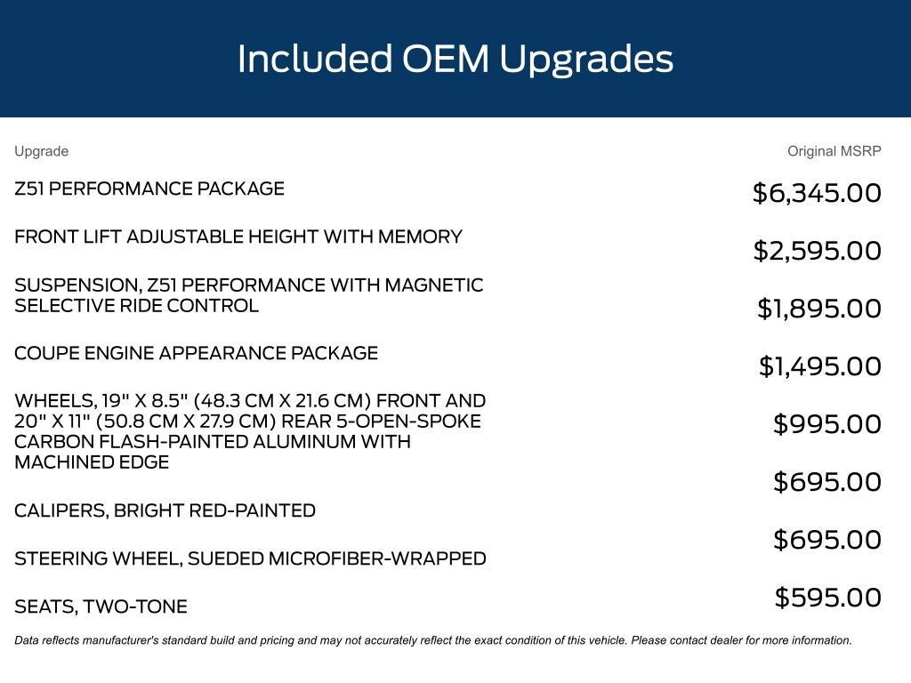 Equipped with an array of advanced features, this Corvette Stingray 3LT is designed to elevate your driving enjoyment to new heights. The Z51 Performance Package, featuring performance brakes, suspension, exhaust, and more, ensures you'll conquer the road with precision and confidence. The front lift adjustable height with memory function and Magnetic Selective Ride Control suspension further enhance the driving dynamics, allowing you to tackle any terrain with ease.